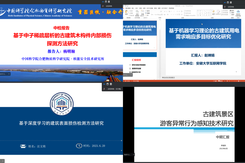 6月20日,安徽大学赵婵娟讲师、中国科学院合肥物质科学研究院副研究员杨明翰、安徽工业大学汪文艳博士、合肥学院副教授年福东以及beats365官方唯一王坤侠副教授和王程讲师分别向安徽省古建筑智能感知与高维建模国际联合研究中心的评审专家进行最新的研究进展的汇报。座谈会以线上形式进行交流,由研究中心副主任邵慧主持,平台老师和评审专家共同参会。