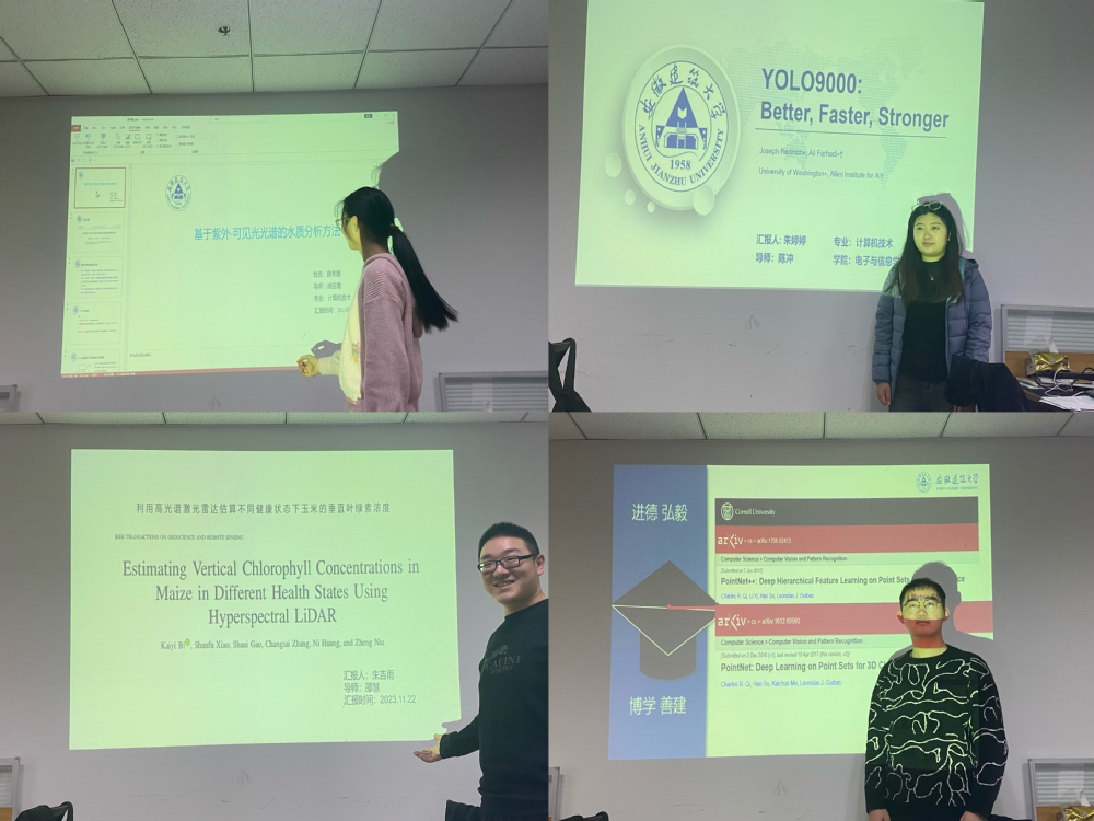 11月22日下午,研究中心在实验综合楼608举办小型研讨会。来自研一的四名同学分别汇报各自领域的研究内容。朱吉雨同学和谷攀登同学汇报了关于高光谱激光雷达应用的研究成果,朱婷婷同学和薛芙蓉同学分别汇报了YOLO9000的算法原理、基于紫外-可见光光谱的水质分析方法。