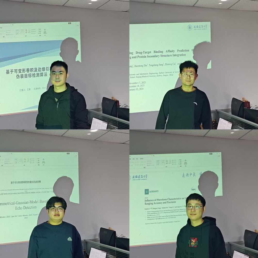 3月20日中午午,研究中心在实验综合楼608举办小型研讨会。来自研二的四名同学分别汇报各自领域的研究内容。李幸运同学和张胡龙同学汇报了关于高光谱激光雷达方面的具体应用,赵宗豪同学和王旭同学分别汇报了关于图像分割领域和药物-靶标相互作用的预测方向的最新研究成果。