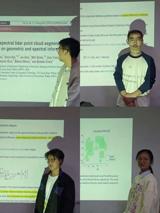 谷攀登同学汇报关于基于深度学习的深度学习网络配置网络,展示了如何通过自动化配置深度学习网络的架构,提升模型的性能和泛化能力。刘国庆同学汇报了关于高光谱激光雷达点云分割方向的优化算法,大幅提升了点云数据在复杂场景中的分割精度。赵杰同学汇报了高光谱与RGB图像融合方面的研究,他重点介绍了如何利用多源信息互补,提升影像数据的空间和光谱分辨率。薛芙蓉同学做了基于透射光谱数据增广的方法调研,通过创新的数据增广策略,提升了模型对小样本数据的适应能力。为相关领域的发展提供了新思路。