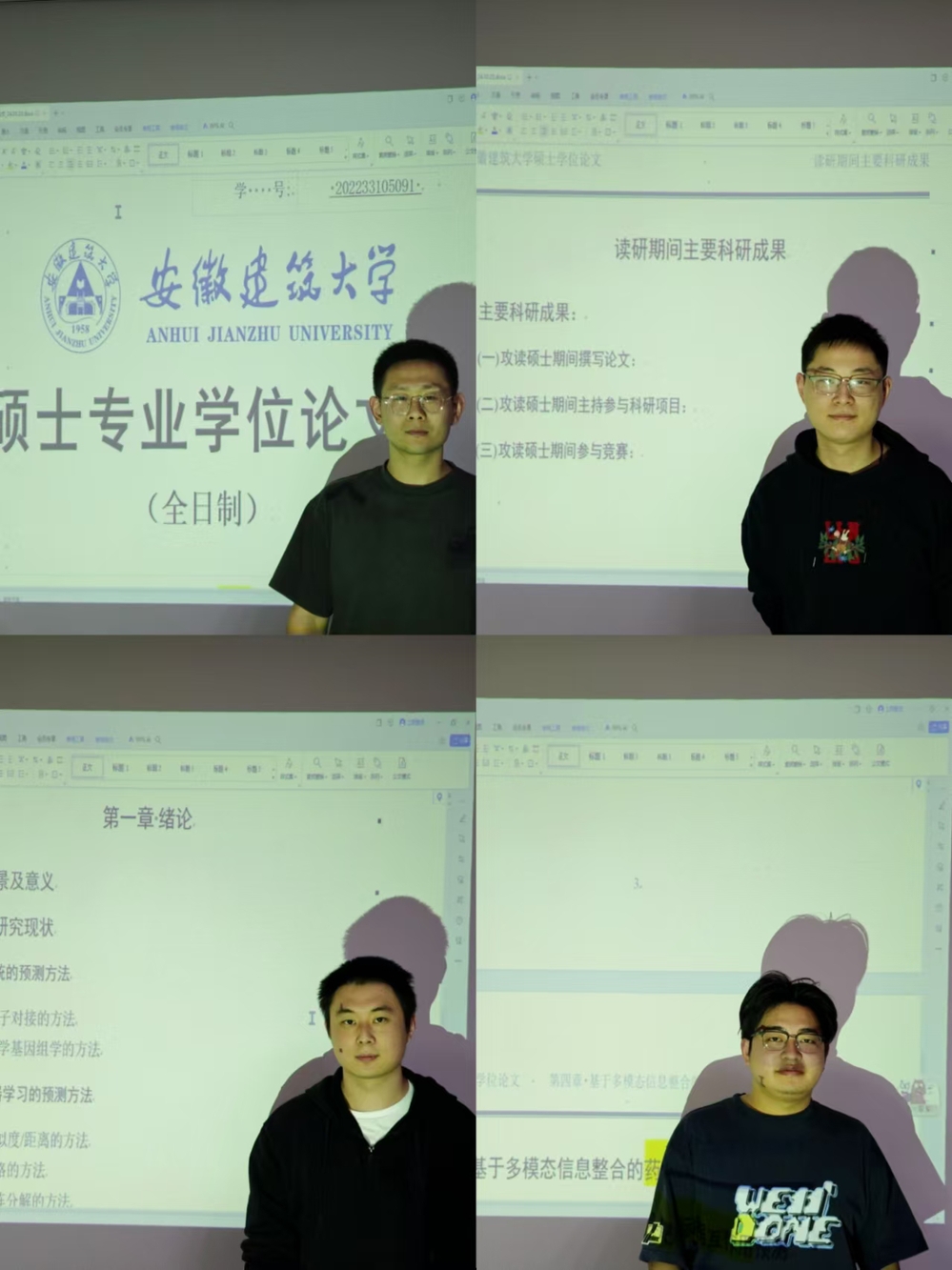 10月23日中午,安徽省古建筑智能感知与高维建模国际联合研究中心于徽风楼(原实验综合楼)608办公室举行了一场小型研讨会。研三的四名学生——王旭、张胡龙、李幸运和赵宗豪,分别对各自的硕士毕业论文框架进行了详细汇报。这次汇报不仅展示了他们在各自研究领域的深入思考,也标志着他们即将迎来硕士研究的关键阶段。