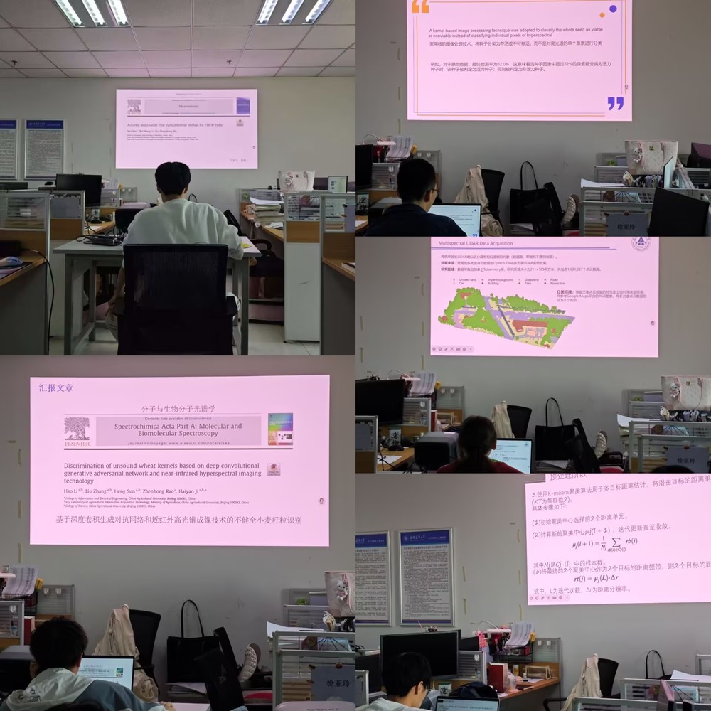 盛宇宏同学分享了其在高光谱图像处理方面的探索成果。他提出了一种面向大豆活力快速检测的算法,结合核图像处理技术,并以最佳检测率52%为阈值对种子进行分类,实现了对存活与不可存活大豆的有效判别。最后,黄书龙同学汇报了基于深度卷积生成对抗网络(GAN)与近红外高光谱成像技术的研究进展。该方法应用于不健全小麦籽粒的识别任务,在提升分类器准确率方面取得了显著成效,展现了深度学习与高光谱技术融合的广阔应用前景。