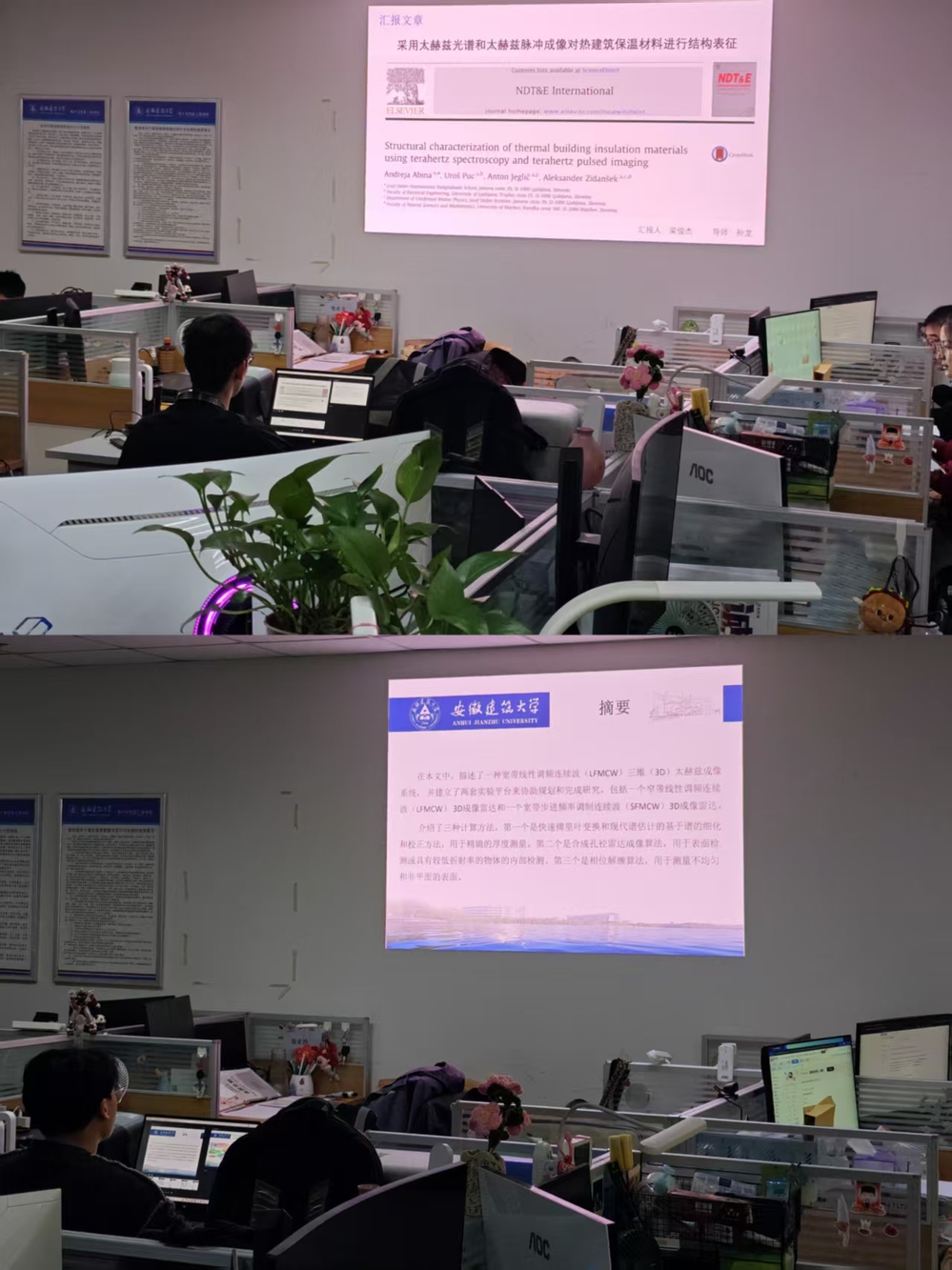 梁俊杰同学聚焦太赫兹光谱/脉冲成像在建筑保温材料的结构表征。通过吸收谱估计与层析重建,报告展示了材料内部层间结构与缺陷的可视化证据,论证了THz在建筑材料无损检测中的潜力与应用边界。