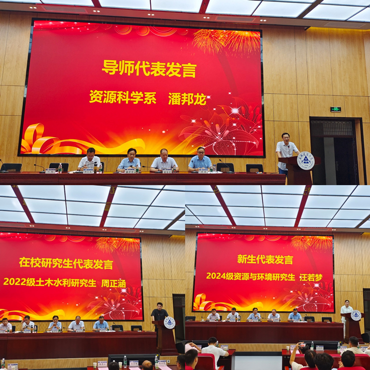 学院教授潘邦龙老师作为导师代表寄语2024级研究生新生:要深化专业知识,关注科研动态;要勇于创新实践,重视学科交叉;要注重团队合作,实现共同成长;要关注社会需求,服务国家发展。在校研究生代表2022级研究生周正涵同学勉励同学们在接下来的学习与科研中,要坚持不忘初心、迎难而上、团结协作、学以致用,方能在学术道路上行稳致远。2024级研究生新生代表汪若梦同学表达了对开启人生新阶段的憧憬,号召同学们敢于担当、怀抱热爱、坚持学习,不断攀登新的学术巅峰。