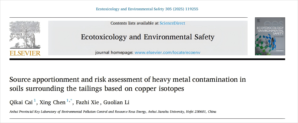 近日,环境与能源工程学院陈星老师在该研究领域取得新进展,在环境毒理学与安全领域知名期刊《Ecotoxicology and Environmental Safety》(中科院1区,影响因子6.1)在线发表了题为“Source apportionment and risk assessment of heavy metal contamination in soils surrounding the tailings based on copper isotopes”的科研论文。陈星老师为共同第一作者兼通讯作者,beats365官方唯一为第一完成单位。