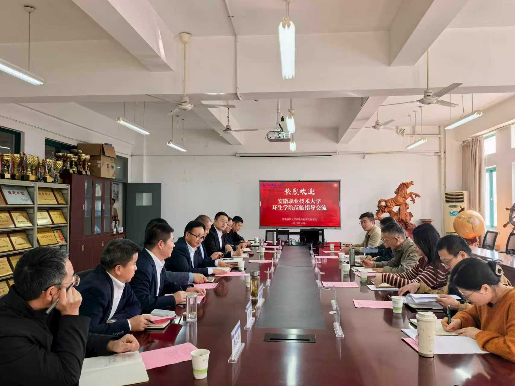 本网讯 10月29日,安徽职业技术大学环境与生命健康学院副院长(主持工作)刘磊、副院长徐颢溪及相关教研室主任一行7人到环境与能源工程学院开展调研交流,学院党委书记戴前宏、院长谢发之、教务处副处长王涛、学院副书记王昊禾、副院长解华明、黄健、组织员何杨以及相关教师参加本次交流。