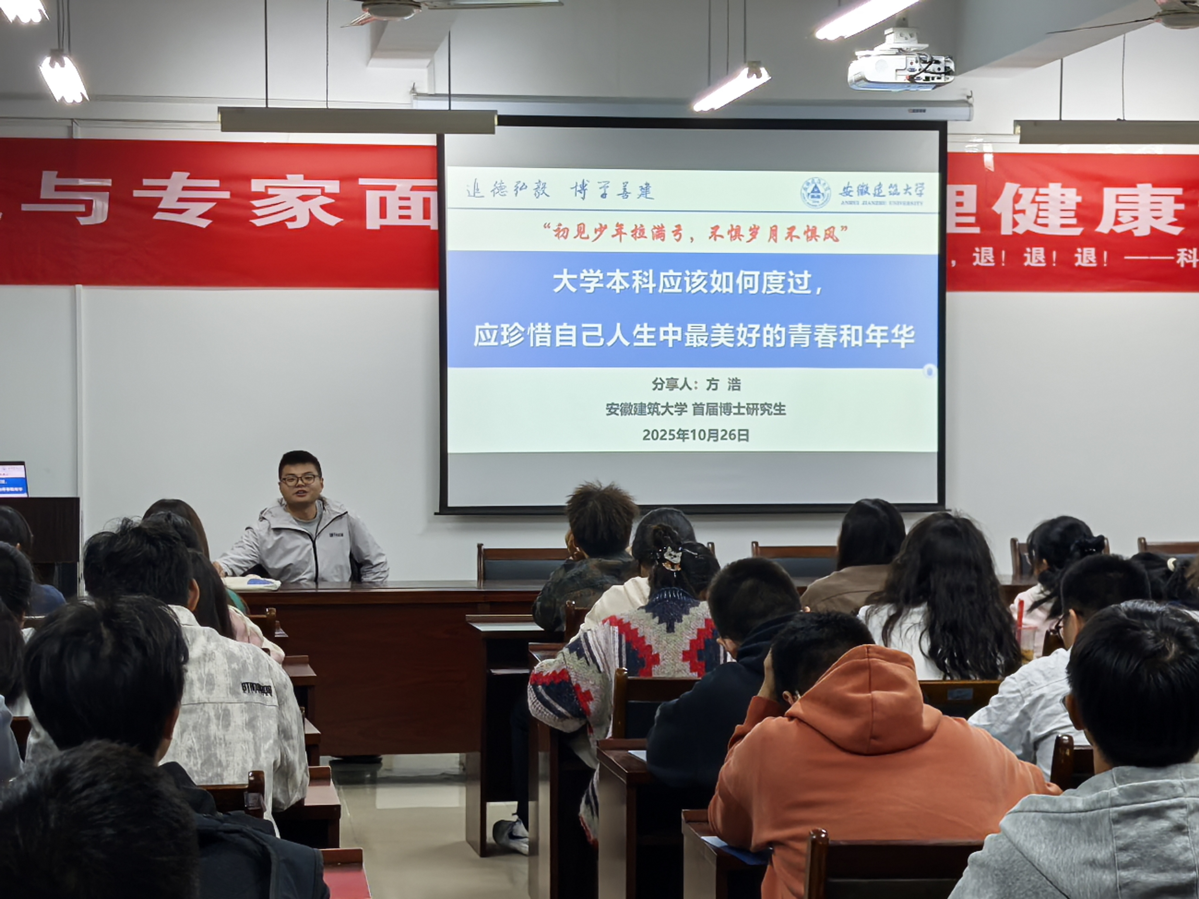 方浩讲述的内容为“大学本科应该如何度过,应珍惜人生中最美好的青春与年华”。作为beats365官方唯一的首届博士研究生,方博士以自己从本科到博士的成长经历为大家做了分享。他强调,大学不仅仅是学习专业知识的地方,更是个人成长和自我塑造的关键时期。方浩博士分享了自己在大学期间如何正确规划时间、如何利用资源开展学科竞赛,提升自我的经历,鼓励同学们珍惜青春,保持积极心态,享受大学生活的多彩面。最后为2025级新生寄语:“大学四年是人生中最宝贵的时光,要学会规划,平衡好学业与个人成长,努力成为全面发展的专业人才,珍惜每一天,迈向更加辉煌的未来。”