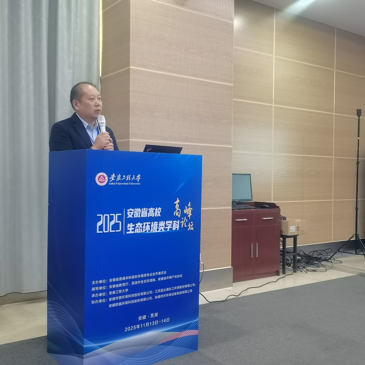 本网讯 11月14日,由安徽省普通本科高校环境类专业合作委员会主办、安徽工程大学承办的“2025年安徽省高校生态环境类学科高峰论坛”在芜湖顺利召开。安徽工程大学校长黄友锐教授,中国工程院院士、同济大学徐祖信教授(线上),中国工程院院士、中国科学技术大学俞汉青教授,安徽省教育厅高等教育处处长蒋正飞,安徽省环境保护产业协会常务副会长、秘书长张登亮,安徽省普通本科高校环境类专业合作委员会主任花日茂,芜湖市生态环境局督查专员王文婧,同济大学环境科学与工程国家级实验教学示范中心副主任刘佳教授等嘉宾出席。环能学院党委副书记、院长谢发之应邀带队参会并作报告。