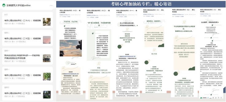 学院团委新媒体中心与二级心理辅导站联手打造考研专属线上陪伴平台,历时数月持续推出26期考研主题推文与短视频。内容兼具实用性与治愈感,既有针对公共课、专业课的冲刺技巧梳理、错题复盘方法分享,也有心理调适小妙招、考前焦虑缓解指南;既邀请往届高分学长学姐分享备考心路与应试经验,也以温情文字送上每日鼓励,用“加油语录”“备考小贴士”“冲刺微视频”为学子打气。同时,引入AI智能体“环宝”,依托学院专业特色与情感计算技术,为学子提供7×24小时心理疏导与个性化支持,成为学子备考路上的“心灵伙伴”。