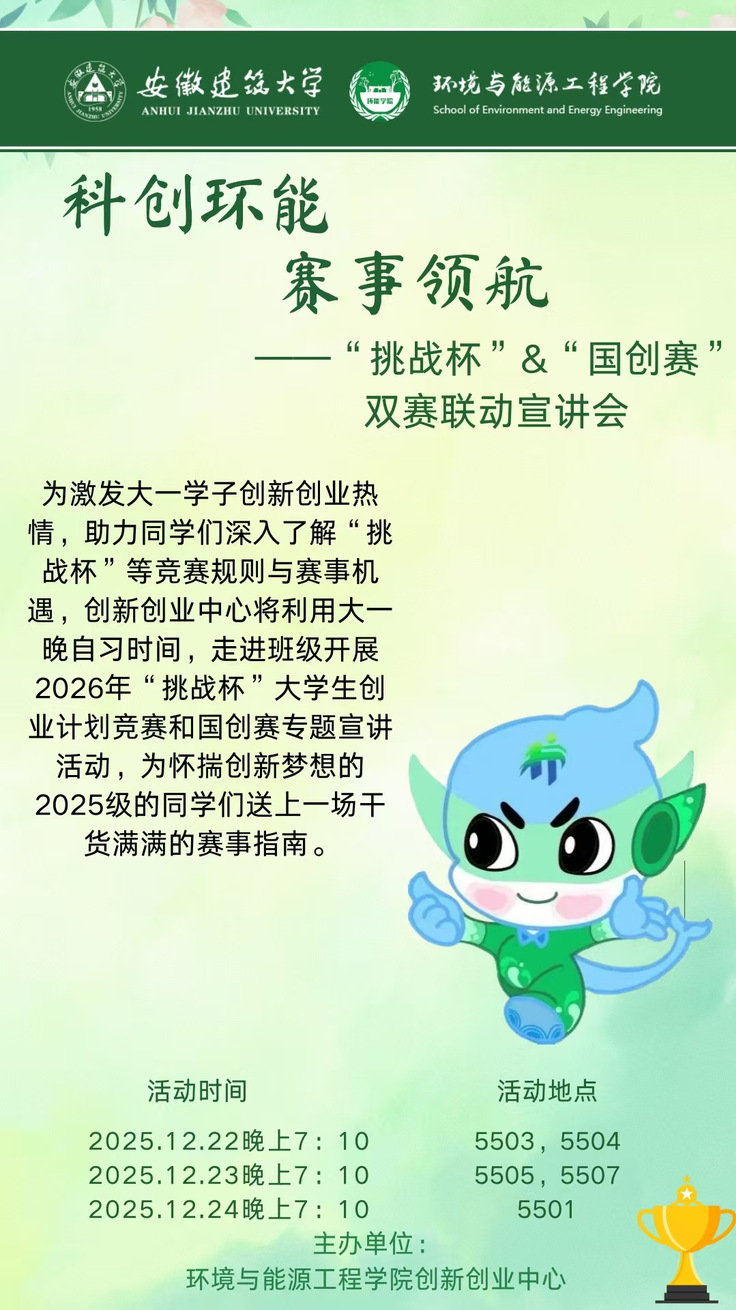 此次双赛联动宣讲,是学院“新生创新创业启航计划”的关键举措,更是“科创环能·赛事领航”品牌育人的重要开篇。学院创新创业中心负责人表示,通过品牌化活动载体,旨在引导新生从入学之初就筑牢创新意识、找准创业方向,为未来参与高水平赛事积累实战经验。形成的。下一步,学院将持续以“品牌引领、学科支撑、赛事赋能、成果转化”良性育人循环为核心,迭代推出赛事专项培训、优质项目孵化、导师一对一帮扶等系列服务,全力助推更多环能学子在创新创业赛道上跑出“加速度”,绽放青春光彩。(作者:孙晓庄、徐欣欣、林欣怡、姚志远;一审:侯晓云;二审:王昊禾;三审:戴前宏)