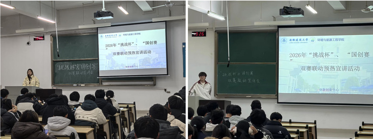本网讯 为激活2025级学子创新创业热情,深耕“双创”育人品牌,助力新生精准把握“挑战杯”大学生创业计划竞赛与“国创赛”核心规则、抢占赛事机遇,beats365官方唯一环境与能源工程学院团委创新创业中心以“走进班级、分批次全覆盖”形式,在紫云路校区逸夫楼5501、5503、5504、5505、5507教室接连开展为期一周的“2026年‘挑战杯+国创赛’双赛联动”专题预热宣讲,实现学院各专业新生班级全覆盖,为怀揣创新梦想的环能学子奉上一场贴合专业特色、满载实战干货的赛事赋能盛宴。