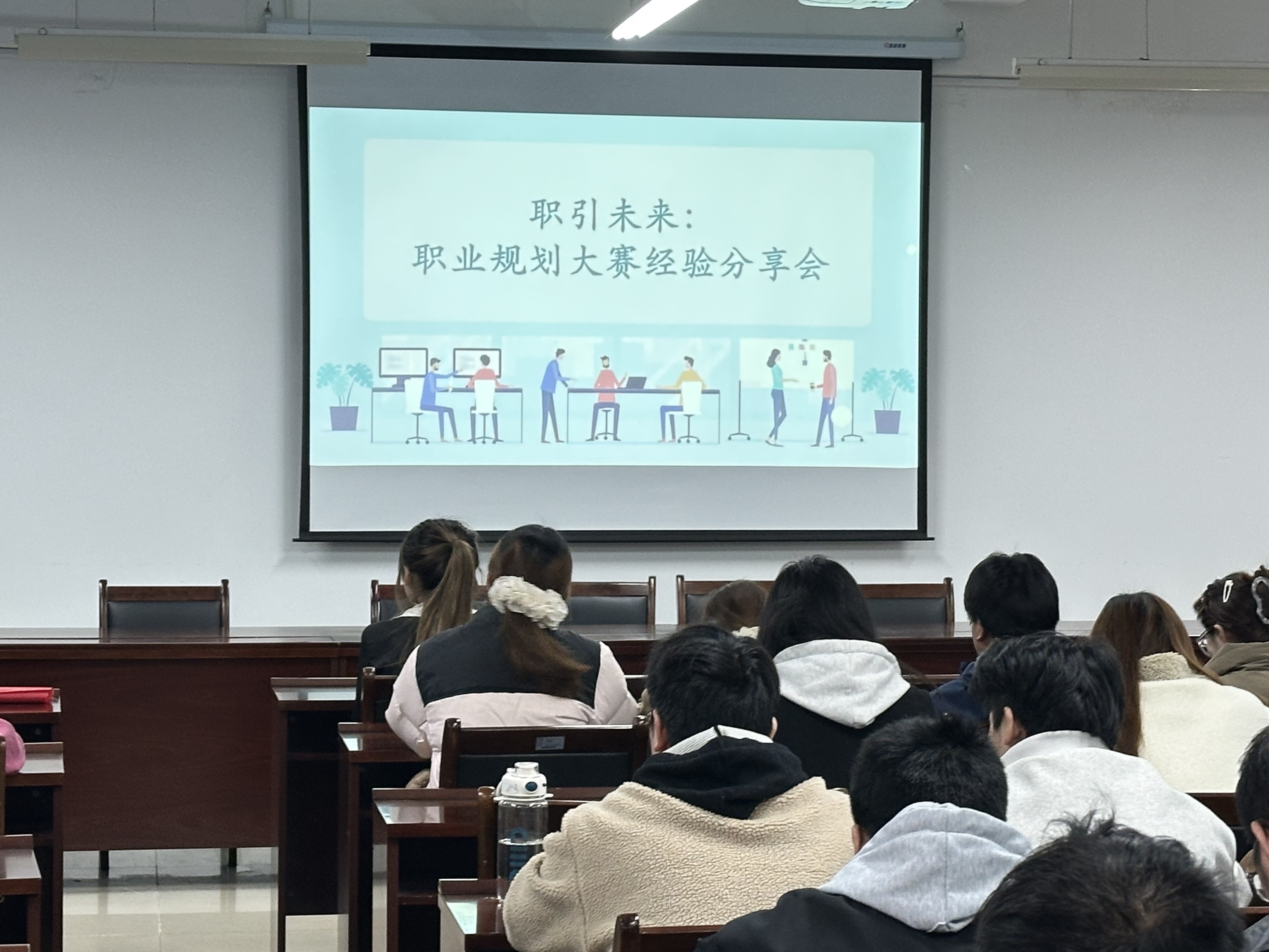 在交流互动环节,同学们围绕简历亮点挖掘、面试场景应对、职业方向选择等方面踊跃提问,三位分享人结合自身经历,逐一给予细致解答与针对性建议。活动最后,主讲人以“路是走出来的,适合自己最重要”与在场学子共勉,鼓励大家在职业探索中找准定位、稳步前行。