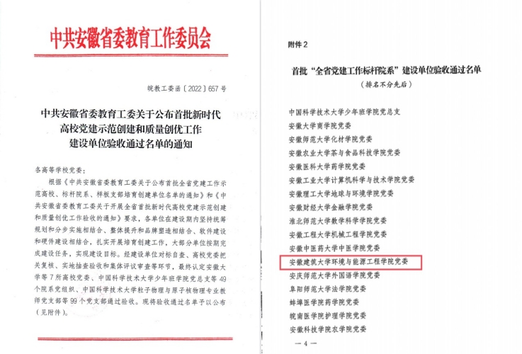 党建品牌建设成效显著。2022年学院党委获批安徽省首批“全省党建工作标杆院系”,学院多次斩获校“宣传工作先进单位”“校园十佳网站”“优秀微信公众号”“就业工作先进单位”“学校先进基层党组织”等荣誉称号。学院基层党支部建设成果丰硕,先后有5个党支部获校级“先进基层党组织”称号,2个党支部成为省级“双创”样板党支部,3个党支部成为学校“双创”样板党支部,1个教师党支部通过校级首批“双带头人”教师党支部书记工作室验收,1个教师党支部获批校“双带头人”教师党支部书记工作室建设单位,且所有党支部连续3年在学校党支部标准化建设验收中实现100%达标。撰写的党建工作案例获全国高校思想政治工作创新发展论坛优秀工作案例、安徽省基层思想政治工作优秀创新案例、全国能源类学院党建思政优秀工作案例一等奖1项、二等奖1项;撰写的党建论文获全国能源类学院党建思政优秀论文一等奖3项、二等奖3项、三等奖1项。党建工作成为学院发展的鲜明特色。