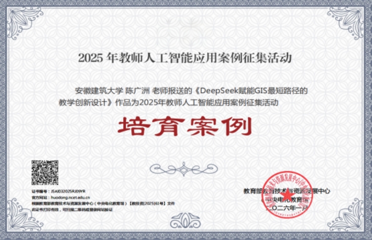 本网讯 近日,教育部教育技术与资源发展中心(中央电化教育馆)公布了2025年教师人工智能应用案例征集活动结果。学院陈广洲教授申报的《DeepSeek赋能GIS最短路径的教学创新设计》成功入选2025年教师人工智能应用案例征集的培育案例名单。