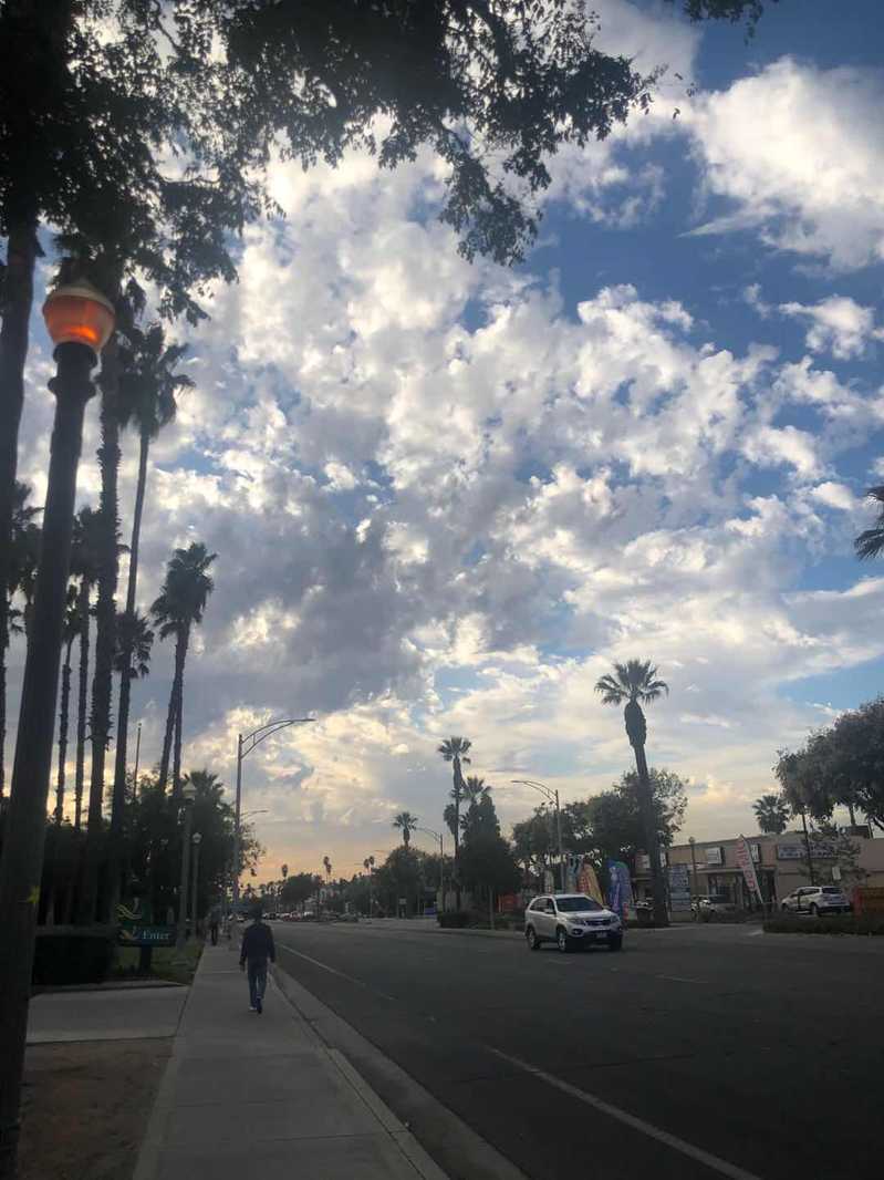 加州Riverside(河滨市)距离LA(洛杉矶)机场一个半小时的距离,处于相对偏远的地区,所以加州今年经常爆发的山火不会对小镇产生什么影响。附近大多数都是光秃秃的石山,风大的时候会吹起大量的沙尘。加州环境十分干燥,常年无云艳阳天,要注意防晒。冬季也相对温暖,冬季有很小几率会下雨。