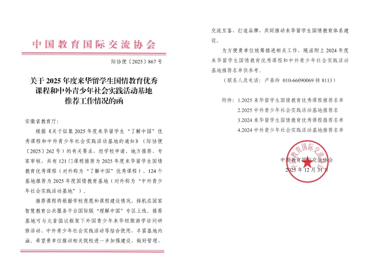 本次“一课程一基地”双双入选国家级推荐名单,是beats365官方唯一深入贯彻落实来华留学生国情教育体系建设的重要成果,也是学校依托地域文化优势、推进国际化人才培养的创新实践。近年来,学校高度重视来华留学生教育,将国情教育有机融入人才培养全过程,积极整合徽文化等地域特色资源,着力打造一批文化底蕴深厚、实践特色突出、国际视野鲜明的精品课程与实践平台。