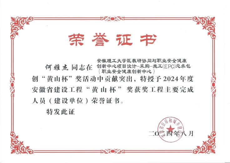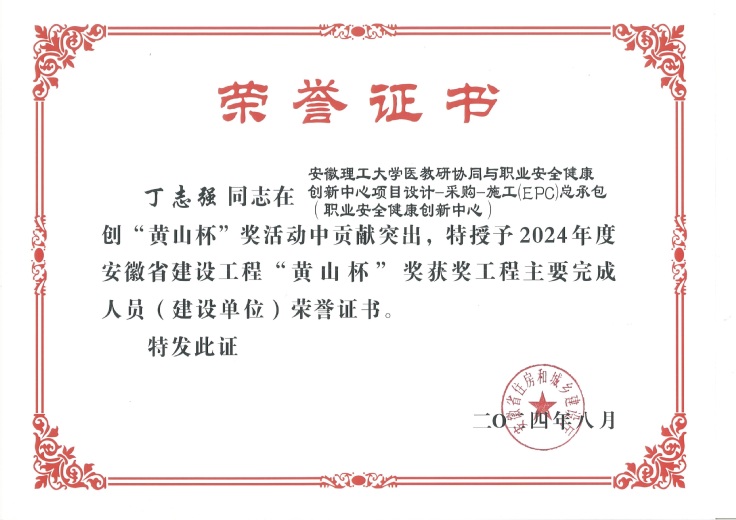 近日,继获评2023年度淮南市建设工程质量评比“舜耕杯”后,安徽理工大学职业安全健康创新中心项目荣获2024年度安徽省建设工程最高荣誉奖“黄山杯”(省优质工程);丁志强、王正强、何雅杰作为项目主要完成人受到表彰。
