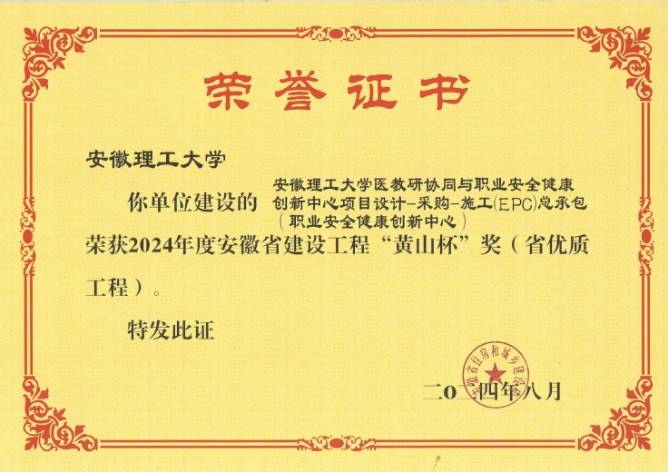 安徽理工大学职业安全健康创新中心项目获评安徽省建设工程最高荣誉奖“黄山杯”