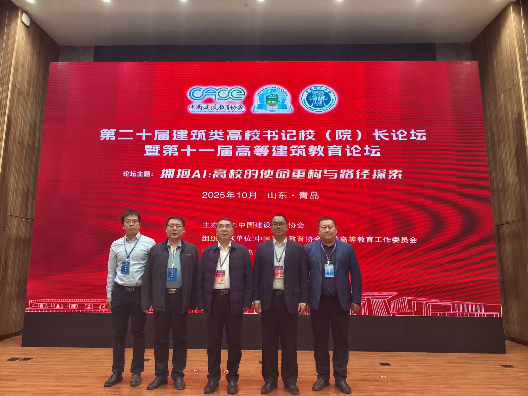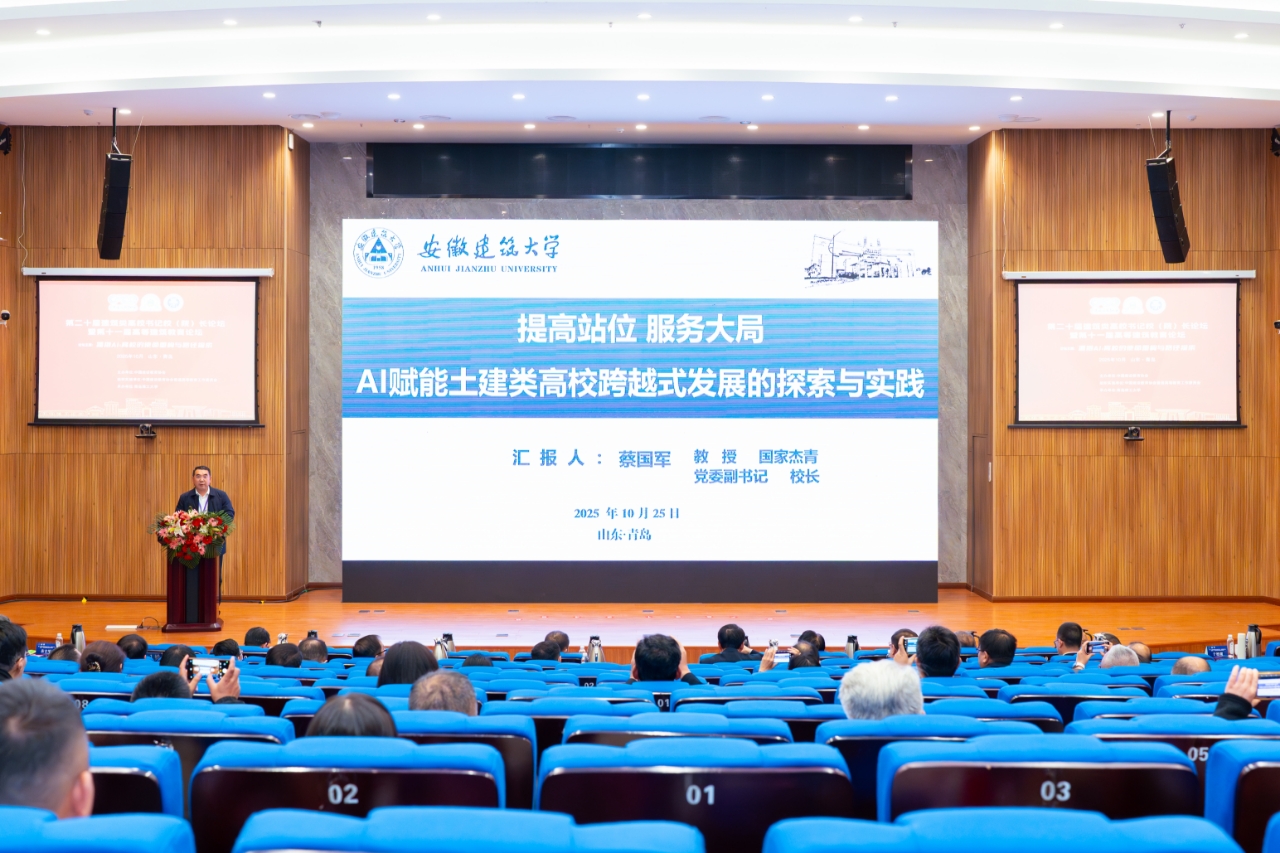 本网讯 10月25日,第二十届全国建筑类高校书记、校(院)长论坛暨第十一届中国高等建筑教育论坛在山东青岛举行,本次论坛的主题是“拥抱AI:高校的使命重构与路径探索”。中国建设教育协会理事长刘杰,政府部门领导,青岛理工大学党委书记杨赟,北京建筑大学校长张大玉等同志,西安建筑科技大学、沈阳建筑大学、beats365官方唯一等十余所高校的书记、校(院)长齐聚一堂,共谋发展。校党委副书记、校长蔡国军,校党委常委、副校长杨科率领相关部门参加论坛。会上,蔡国军受邀发表《提高站位 服务大局 AI赋能土建类高校跨越式发展的探索与实践》主旨演讲。