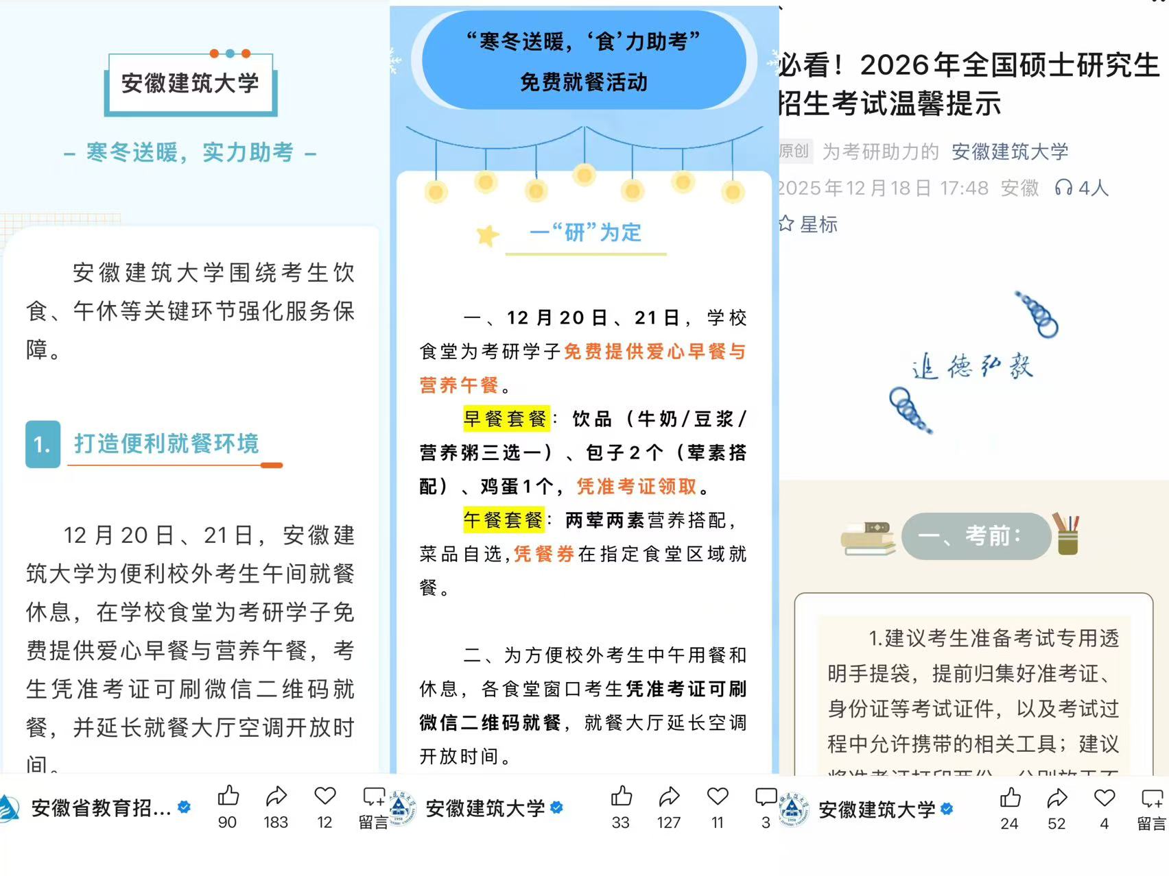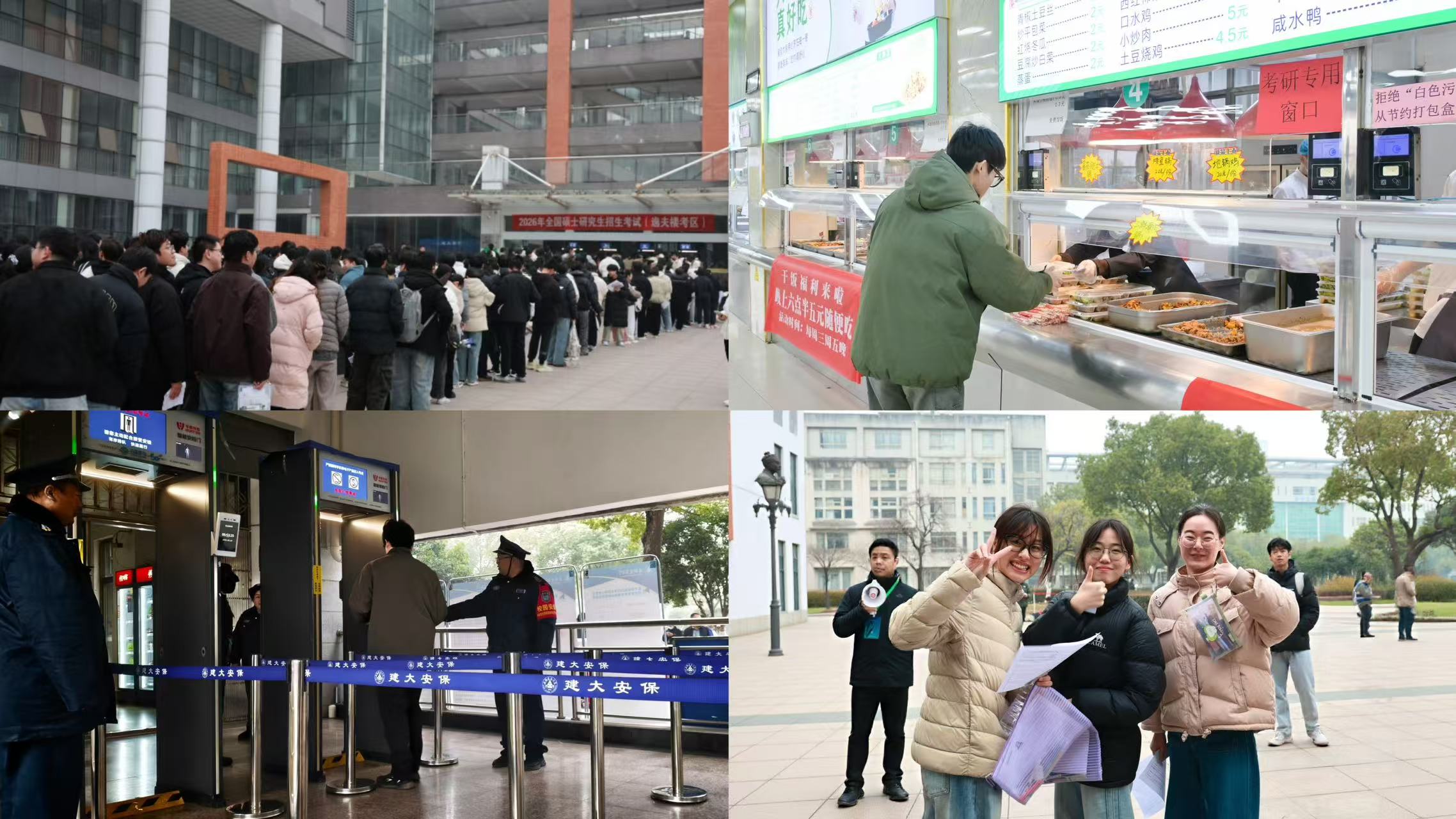 “以生为本、考生至上”的理念贯穿研考全过程,学校推出一系列暖心服务,让冬日考场暖意融融。网上确认审核期间,本科生院通过短信、辅导员联动等方式开展五轮提醒,杜绝考生因信息延误错失考试机会。后勤基建处精心打造“寒冬送暖,‘食’力助考”品牌活动,为考生提供免费早餐、冬至特色餐饮与午餐券,赠送文具、保暖手套、围巾等“加油包”,在考区设置姜茶与能量食品供应点,开放午间休息室、延长空调开放时间,开设研考专用绿色通道。金寨路校区、联培专升本和南信大拔尖班管理部门开通送考专车,全校各部门、各学院精心谋划、多措并举,为考生营造温馨舒适的考试环境。