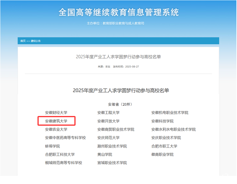 继续教育学院将以此次入选为契机,持续深耕产业工人教育与服务领域,精心组织实施相关项目,及时凝练优秀经验与创新模式,为提升我省建筑产业工人队伍整体素质、赋能建筑产业创新升级、服务现代化美好安徽建设贡献坚实的建大智慧与建大力量。(文:李云芳;一审:戴娟;二审:马晓敏;三审:李伟)
