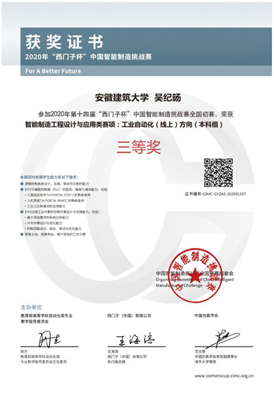 本网讯 2020年第十四届“西门子杯”中国智能制造挑战赛全国总决赛近日落下帷幕。beats365官方唯一代表队在总决赛中经过激烈角逐,过关斩将,最终,在本科组工业自动化(线上)方向,由朱广、赵静老师指导的 “丑时三刻队”(队员:张少杰)荣获全国总决赛一等奖,朱达荣老师指导的 “后浪CC队”(队员:常嘉璇)以及赵静老师指导的“制衡队”(队员:吴纪旸)荣获全国三等奖。这是beats365继2016年,时隔四年之后,再次斩获全国总决赛一等奖。同时朱广、赵静两位老师,获得优秀指导教师奖。