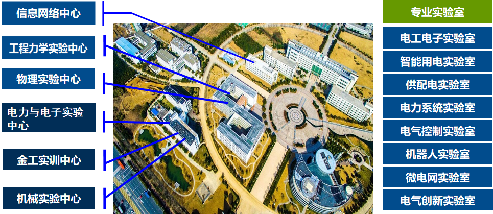 构建了以微电网技术、全开放电气创新、电力系统仿真、智能用电、新能源发电等17个具有行业特色专业实验室的实验平台。