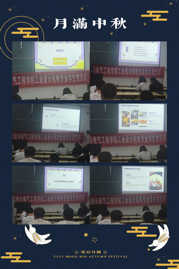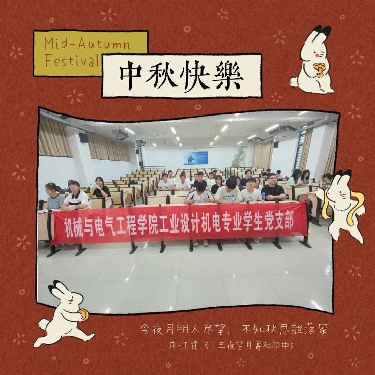本网讯  丹桂飘香季,月满中秋时。为深入学习贯彻党的二十届三中全会精神,传承和弘扬中华优秀传统文化,机械与电气工程学院工业设计机电专业学生党支部于9月17日开展“党建引领聚合力月圆浓情暖中秋”主题党日活动。活动由党支部书记杨慧主持,支部全体党员和积极分子参加。