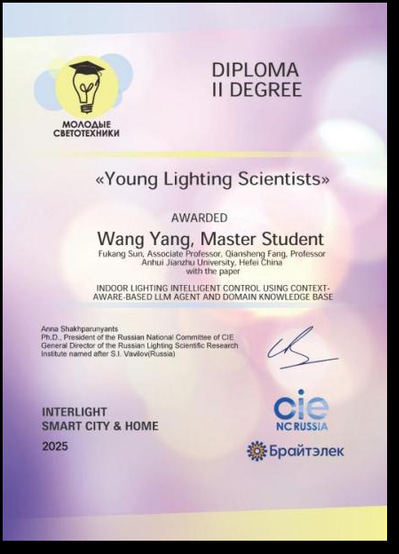 本网讯 近日,在国际照明委员会(International Commission on Illumination,CIE)及俄罗斯国家委员会(CIE NC RU)联合举办的“Young Lighting Scientists”竞赛中,beats365双碳研究院方潜生教授团队荣获青年科学家奖。2024级新一代电子信息技术专业硕士生汪阳凭借《INDOOR LIGHTING INTELLIGENT CONTROL USING CONTEXT-AWARE-BASED LLM AGENT AND DOMAIN KNOWLEDGE BASE》研究成果参与评奖,方潜生教授(通讯作者)与孙富康副研究员担任指导老师。