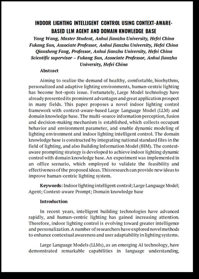 获奖研究成果创新提出了一种基于大语言模型上下文工程的室内照明智能控制框架。通过融合建筑信息模型(BIM)与照明领域标准知识库,借助大语言模型(LLM)的语义理解及上下文推理能力,实现了照明场景的语义理解与环境感知、灯具控制决策生成、灯具“亮度-色温”调节一体化过程,兼顾用户光舒适度及灯具节能特性。实验研究表明,基于提出的框架开展室内照明控制,其响应速度、控制精度等指标完全满足需求。上述研究为建筑室内光环境智能控制提供了新思路、新范式、新模型。研究成果已被“Young Lighting Scientists”竞赛委员会推荐至《Light & Engineering》国际期刊(SCIE检索)发表。