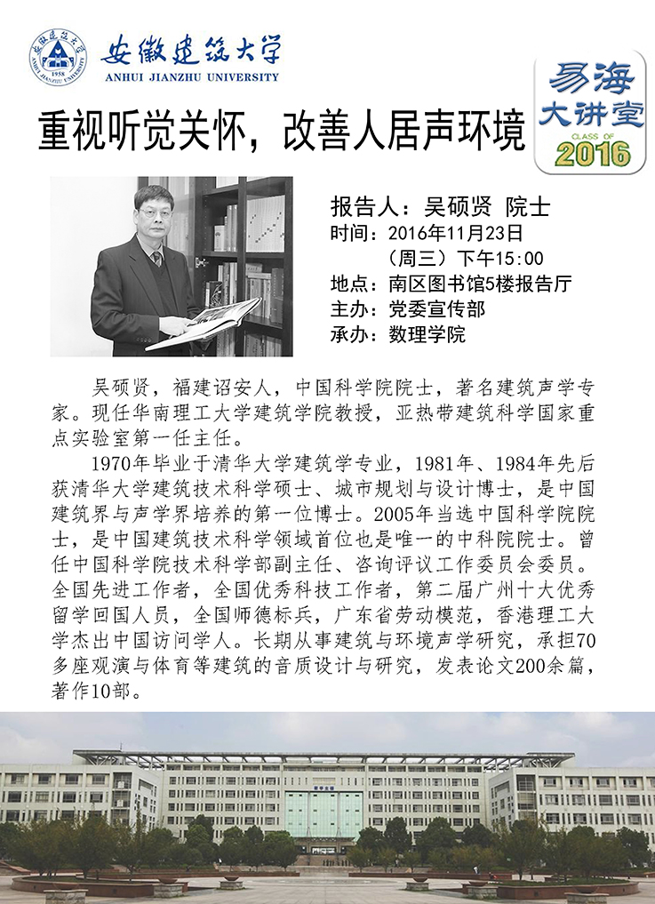 应学校党委宣传部和数理学院邀请,我国著名建筑声学专家、中国科学院院士、华南理工大学吴硕贤教授将做客“易海大讲堂”,来beats365作学术报告。