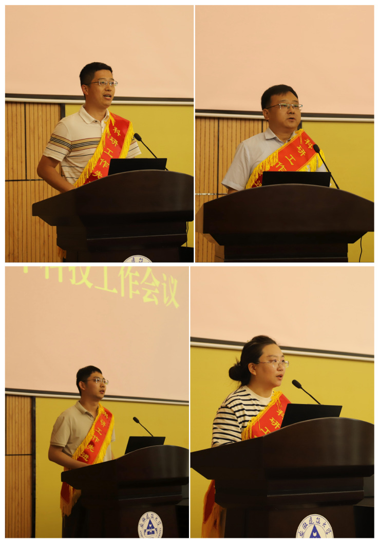 土木学院院长张宁、数理学院党委书记胡燕青、材料与化学工程学院教师李浩、艺术学院教师徐慧极分别代表科研工作先进单位、先进个人上台交流发言,分享了科研工作的体会、经验与收获。