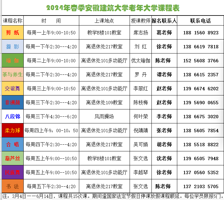 一、老年大学2024年春季学期拟开设12个专业班级。因教学资源有限,每位学员限报5门课程。已入班级微信群的学员请不用重复报名。