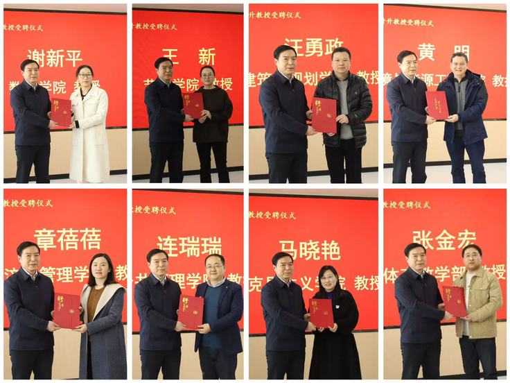 首先举行2024年教授受聘仪式。校党委副书记、校长黄显怀为2024年新晋升教授逐一颁发聘书。材料与化学工程学院王平教授、马克思主义学院马晓艳教授作为新晋升教授代表发言。两位教授在发言中表达了激动和振奋的心情,对过去取得的成绩进行了总结,也对下一阶段为学校高质量发展作出更大贡献提出明确的思路和展望。