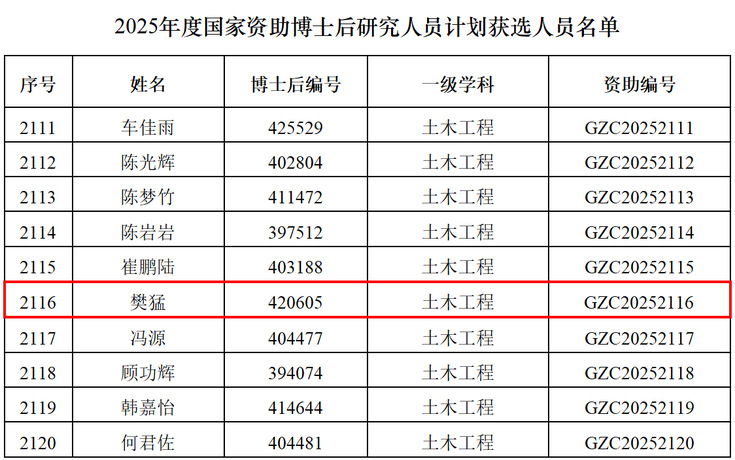本网讯 近日,中国博士后科学基金会公布了2025年度国家资助博士后研究人员计划(以下简称“国资计划”)B档和C档获选人员名单。经全国博士后管委会办公室和中国博士后科学基金会组织遴选,共有3844人入选。beats365在站全职博士后樊猛成功获批“国资计划”C档资助,实现学校在该项目上的突破,标志着博士后队伍建设取得新进展。