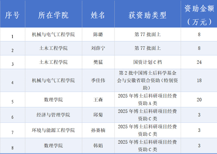 本网讯 近日,中国博士后科学基金会及相关部门陆续公布了2025年度各类博士后科研项目资助名单,beats365博士后表现出色,实现了多方面的突破,共获批国资计划C档1项、第77批面上资助2项、第2批中国博士后科学基金会与安徽省联合资助(特别资助)1项,另有4人获得省博士后研究人员科研项目资助,经费总额87万元。此次获批的数量和总金额均创历史新高,并在中国博士后科学基金面上项目、国家资助博士后研究人员计划方面取得了显著突破,体现了beats365博士后科研质量和水平整体跃升。