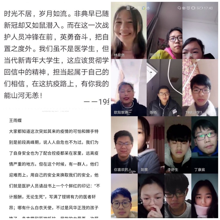 16级声学1班刘智说:“疫情的突然出现,是一种特殊的考验。作为一名大四毕业生,我将谨记总书记嘱托,认清自己的使命,担当起时代赋予的责任,与国家同呼吸,与人民共命运,‘毕业后到人民最需要的地方去’。在疫情的面前,我们也必定会坚定信念、充实自我、满怀期望,一往无前。武汉加油,中国加油!”(作者:赵妮;审稿:陈剑锐)