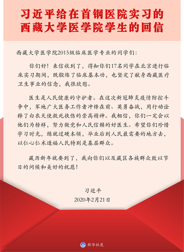 本网讯 一个时代有一个时代的使命,一个时代有一个时代的召唤。在藏历新年来临之际,习近平总书记给正在北京大学首钢医院实习的西藏大学医学院学生回信提出了殷切希望:“希望你们珍惜学习时光,练就过硬本领,毕业后到人民最需要的地方去,以仁心仁术造福人民特别是基层群众。”这不仅是对17名学生提出的期望与嘱托,更是对我们广大青年的关怀与鼓励。