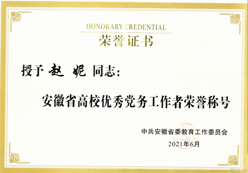 近三年来,党支部书记赵妮曾先后荣获安徽省高校优秀党务工作者荣誉称号、安徽省优秀共青团干部荣誉称号,安徽省教学成果一等奖,校级优秀共产党员和校级优秀党务工作者荣誉称号。
