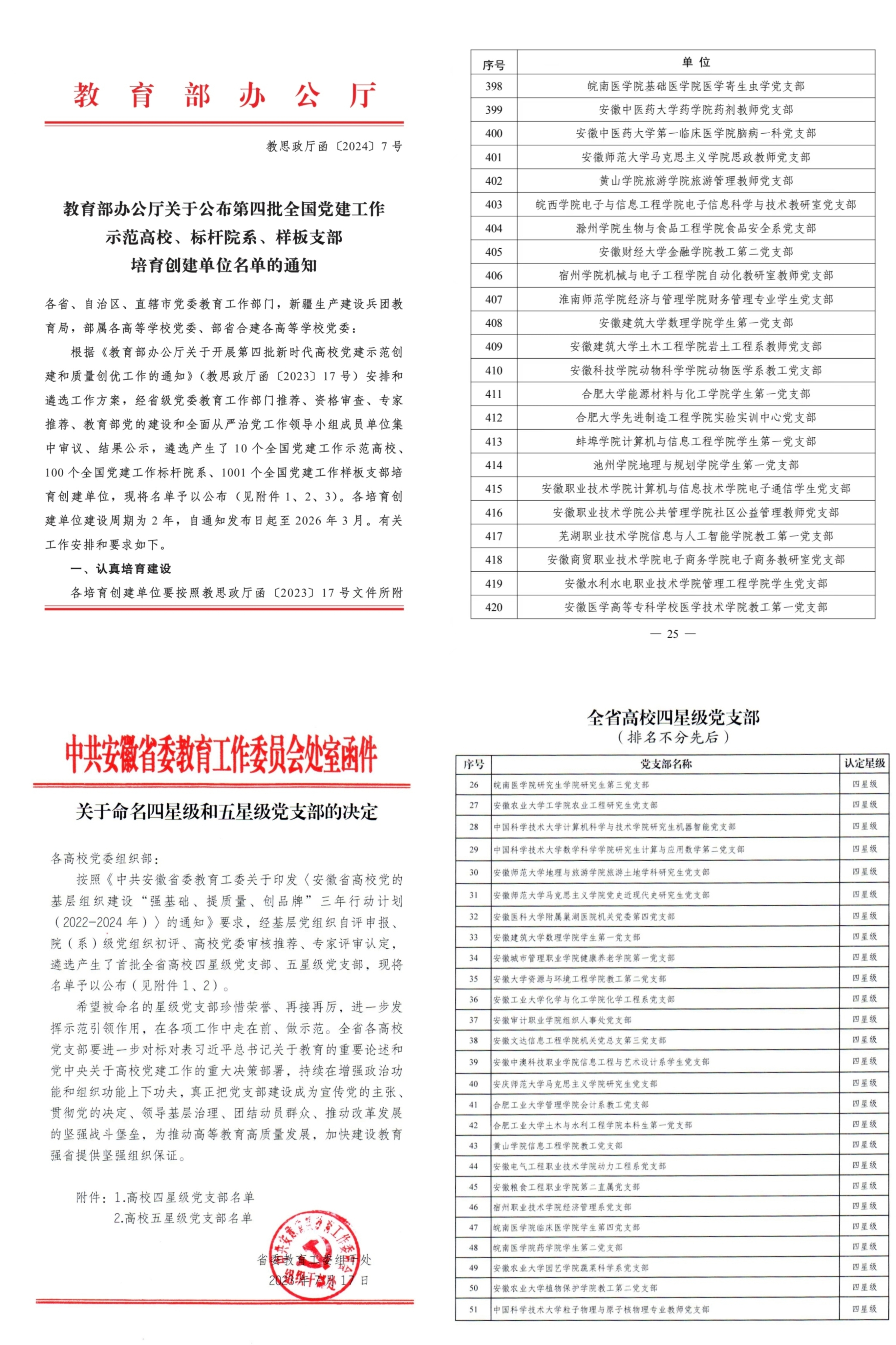 党支部2019年获批首批“全省党建工作样板支部”培育创建单位,2022年通过省委教育工委验收,2023年支部获批安徽省首批全省高校四星级党支部。近年来,支部学生党员参加全国互联网+大赛获国家级银奖2项,全国大学生市场调查与分析大赛国家级三等奖1项、省级二等奖13项、三等奖12项,全国数学建模比赛国家级二等奖2项,省级一等奖10项、二等奖4项、三等奖4项,全国统计建模比赛省级二等奖6项、三等奖6项,美国大学生数学建模竞赛Finalist奖1项、Meritorious奖1项、Honorable奖3项。支委成员赵妮同志获“安徽省高校优秀党务工作者”、“安徽省优秀共青团干部”荣誉称号。