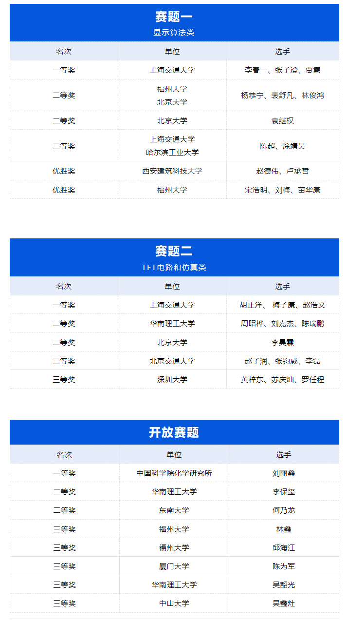 ICDT新型显示技术竞赛每年由SID China主办,面向全国(含港澳台)科研院所博士生、硕士生、本科生。第三届竞赛于3月底公布赛题,并于6月底提交了初赛内容。围绕“显示算法”、“显示硬特性—TFT电路和仿真”以及“开放赛题”3个显示相关试题展开。竞赛旨在激励参赛团队深入探索显示技术的前沿领域,发挥个人科研兴趣与创新能力,提出具有实际应用价值的解决方案。