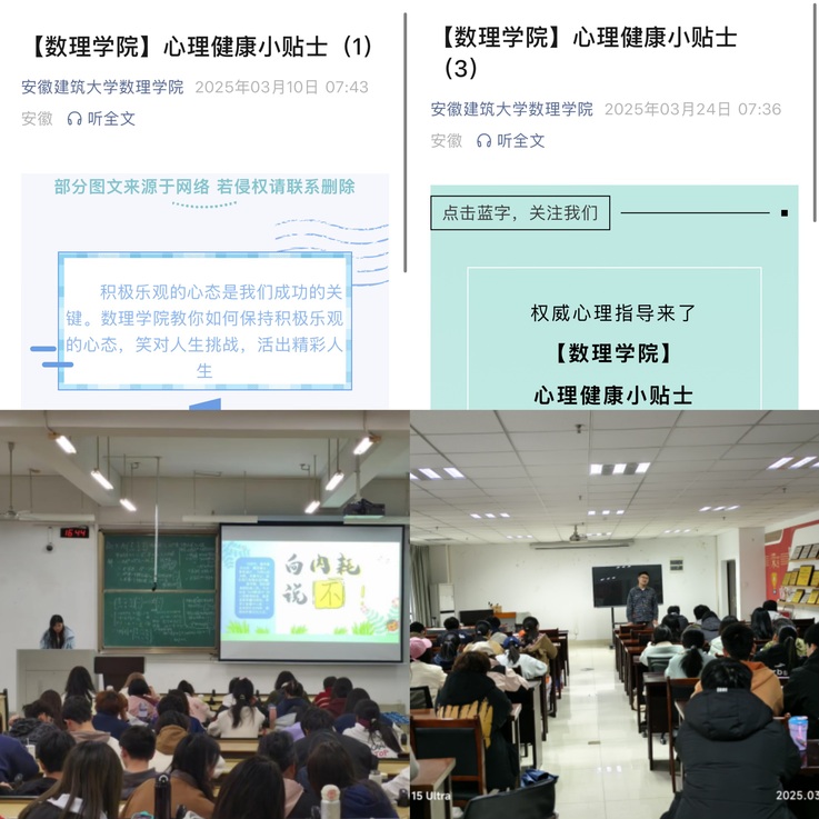 学院高度重视心理健康教育的基石作用,精心构建“线下+线上”双轨并行工作格局。线下,辅导员以主题班会和分类谈心谈话为主要抓手,聚焦不同年级和不同群体可能出现的心理问题,引导学生掌握应对压力的方法。线上,学院微信公众号开辟专门专栏,定期推送丰富多样的科普文章,累计浏览量达200 余人次,让心理健康知识如春风化雨般滋润学生心田。