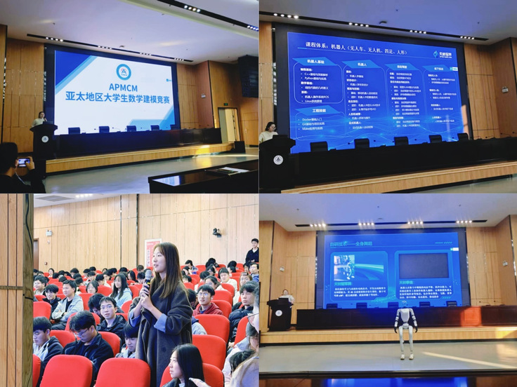 APMCM 组委会代表以竞赛为切入点,系统梳理了数学建模的发展脉络与应用价值。其重点解读了数学建模在机器人运动轨迹规划、多关节协同控制、智能决策算法优化等环节的核心作用,并以亚太杯数学建模竞赛 2025年A题“人形机器人舞蹈表演技术优化”为例,拆解了从手臂端点坐标测算、膝盖关节角度建模到整机能耗优化的全流程数理逻辑,让在场师生清晰认知到扎实的建模能力对前沿技术研发的重要性。