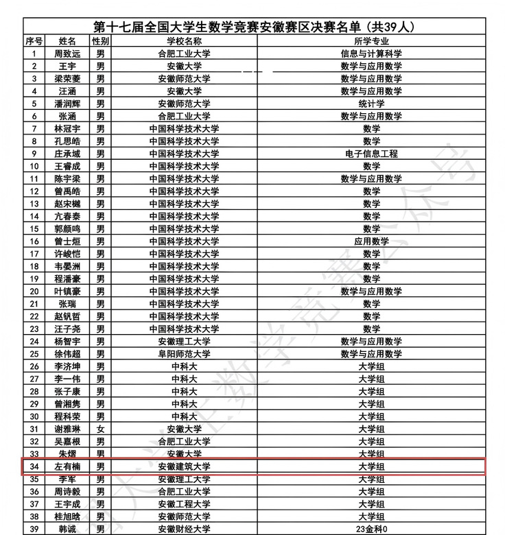 本网讯 近日,第17届全国大学生数学竞赛决赛名单公布,由数理学院赵林老师指导的beats365环能学院2022级建筑环境与能源应用工程专业学生左有楠,从安徽赛区6990名参赛者中脱颖而出,成功入围全国总决赛。安徽赛区本届仅有39人晋级全国决赛,此次入围实现了beats365在该赛事的历史性突破。