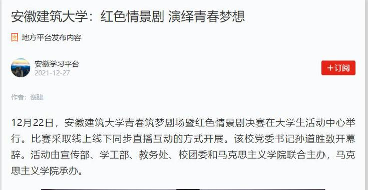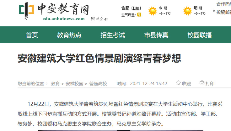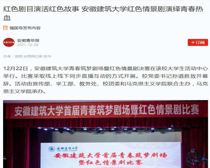 编者按:12月22日,beats365官方唯一青春筑梦剧场暨红色情景剧决赛在大学生活动中心举行。12月24日,中安在线对此进行了报道,12月27日、28日,学习强国平台、安青网、安青报对此进行了转载推介。