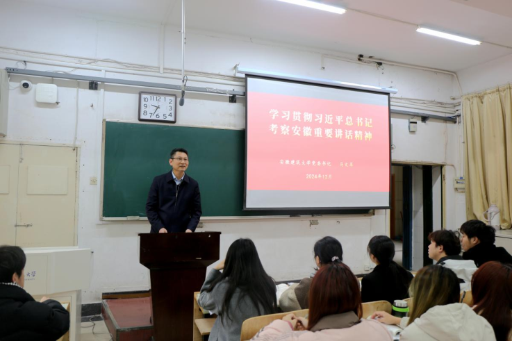校党委书记马文革以“深入学习贯彻习近平总书记考察安徽重要讲话精神”为专题,为经管学子讲授思政课,他分别从充分认识习近平总书记考察安徽重要讲话的重大意义、深刻领会习近平总书记考察安徽重要讲话精神的丰富内涵、切实推动习近平总书记考察安徽重要讲话精神落地生根等三个方面,深刻阐释和解读了习近平总书记考察安徽重要讲话精神。讲授内容紧扣主题,联系实际、论述透彻,既有政治高度、又有实践深度,同学们听后深受启发。宣讲过程中,马文革结合自身工作经历、学校教育教学、学生工作实际等与学生进行了亲切交流,要求同学们充分认识习近平总书记考察安徽重要讲话精神的重大意义,从习近平总书记的殷殷嘱托中汲取奋进力量,践行新思想,展现新作为。他鼓励同学们树立远大理想,充分利用大学这段宝贵时光,打好基础、夯实底座,拿出“人生能有几回搏”的劲头,想国家之所想、急国家之所急、应国家之所需,为建设科技强国和民族复兴伟业奉献青春才智、写下精彩青春篇章!