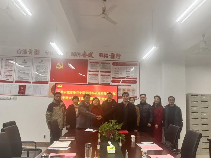 顾永俊简要介绍了科研处主要职能和党支部工作开展情况,希望通过党建共建进一步加深双方友谊,推动双方新时代基层党建工作迈上新台阶;也希望通过双方经常性的交流互动,加强在安徽党史研究、党史课题研究、红色文化融入基层党建等方面合作,实现优势互补、资源共享、互利共赢,助力双方高质量发展。