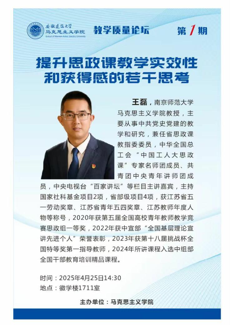 专家简介】王磊:全国高校青年教师教学竞赛思政组一等奖获得者、全国基层理论宣讲先进个人,中华全国总工会“中国工人大思政课”专家名师团成员、共青团中央青年讲师团成员,中央电视台“百家讲坛”等栏目主讲嘉宾,获江苏省五一劳动奖章、江苏省青年五四奖章、江苏教师年度人物等称号。主持国家社科基金项目2项,省部级项目4项,2023年获第十八届挑战杯全国特等奖第一指导教师,2024年所讲课程入选中组部全国干部教育培训精品课程。