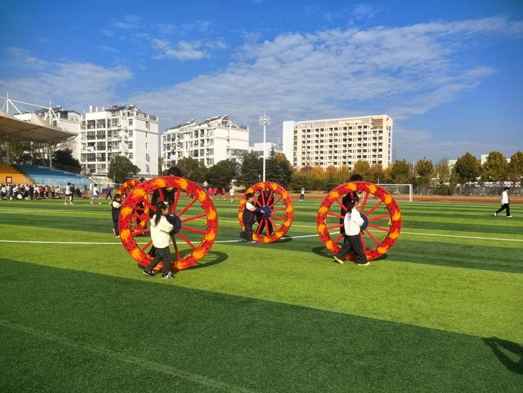 在车队的大学生志愿者手把手的带领下,小学生们在操场上进行了沉浸式的体验,“小车手”们认真学习握轴、走步,表演了“平滚车”、“夹篱笆阵”、“拍绕车”“螺旋车“等等,滚滚车轮,转出阵形,收获笑声。