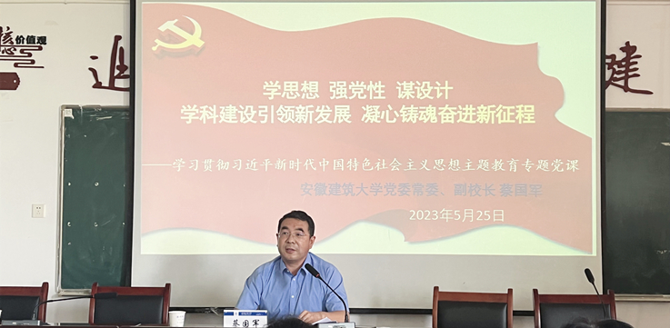 蔡国军讲授了题为《学思想 强党性 谋设计 学科建设引领新发展 凝心铸魂奋进新征程》的专题党课。党课以“习近平新时代中国特色社会主义思想创立的时代背景、丰富内涵”为导入,结合学科建设工作体系构建,深入浅出地讲述了要把习近平新时代中国特色社会主义思想转化为坚定理想、锤炼党性和指导实践、推动工作的强大力量。党课主体内容分为四个部分:一、习近平新时代中国特色社会主义思想创立的时代背景;二、习近平新时代中国特色社会主义思想的丰富内涵;三、以中国式现代化推进中华民族伟大复兴;四、习近平总书记关于教育的重要论述;五、加快学校“315”学科建设工作体系构建,助推学校新时期高质量发展。